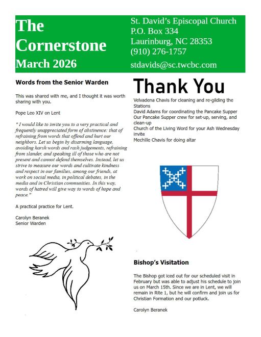 Newsletter Please click on the picture below to view the church newsletter. Upcoming Events Holy Eucharist – March 1, 2026 Holy Eucharist – March 8, 2026 Holy Eucharist with Rt. Rev. Samuel Rodman – March 15, 2026 Holy Eucharist – March 22, 2026 Holy Eucharist on Palm Sunday with Branch Procession – March 29, 2026 Facebook Instagram Share this: Share on X (Opens in new window) X Share on Facebook (Opens in new window) Facebook Like Loading...
