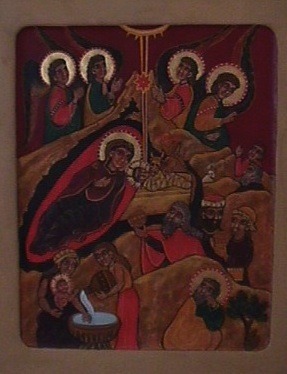 The Nativity :The Star of Bethlehem shines down into the dark cave and the manger scene in the center. Angels sing Glory to God in the Highest and announce the birth to the shepherds on the right. Below the shepherds the three Magi bear their gifts. At the bottom the midwives bathe the baby Jesus, and St. Joseph is lost in wonderment at the mystery.