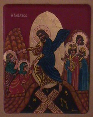 The Harrowing of Hell/Descent into Limbo: The resurrected Jesus goes down into the place of departed spirits to bring salvation to those who have not heard the Good News. He pulls Adam and Eve, representatives of all humanity, out of the darkness of their tombs into his glorious light. As the Old Testament kings and prophets look on, Christ tramples the gates of hell under his feet, and the locks and bars are shattered.