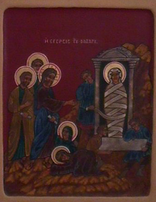 The Raising of Lazarus: Our Lord, flanked by Peter and John the Beloved Disciple, calls the bound Lazarus forth from the tomb. Mary and Martha at his feet are begging Jesus to save their brother. Two men remove the stone from the entrance, and another unwinds the grave clothes, holding his handkerchief to his nose, for Lazarus has been dead for four days!