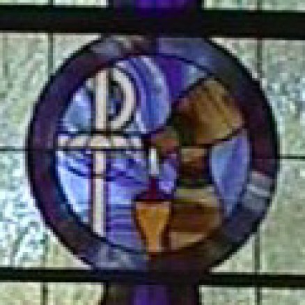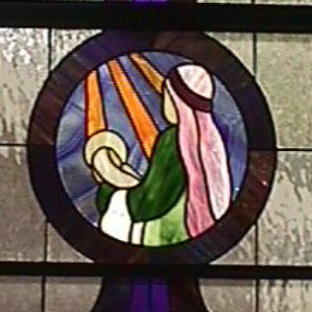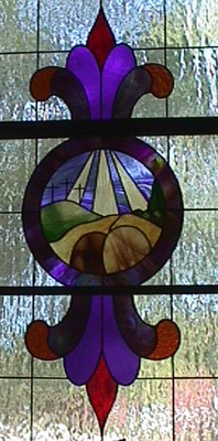 Alpha and Omega Window. The transom window above the front door incorporates an alpha and omega (Christ the beginning and Christ the end) and a cross from the old Morgan windows in a new design by Steve Weir.